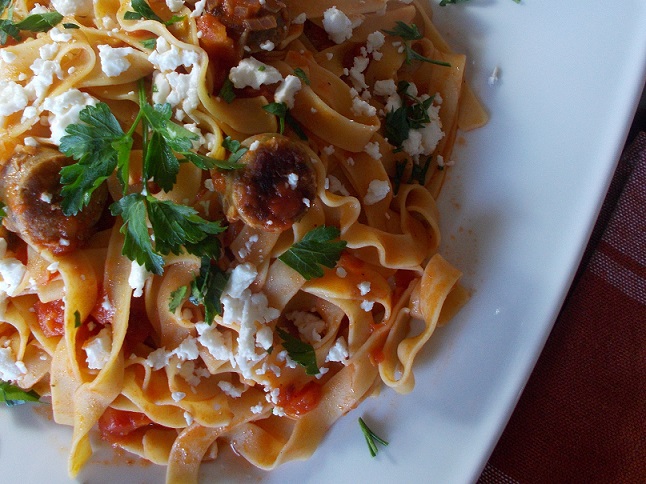 Όταν τα λουκάνικα είναι έτοιμα, και το κρεμμύδι και το σκόρδο έχουν τσιγαριστεί, προσθέτουμε στο τηγάνι την ψιλοκομμένη ντομάτα, αλάτι και πιπέρι (αλάτι με φειδώ στην περίπτωση που θα προσθέσουμε φέτα ).
