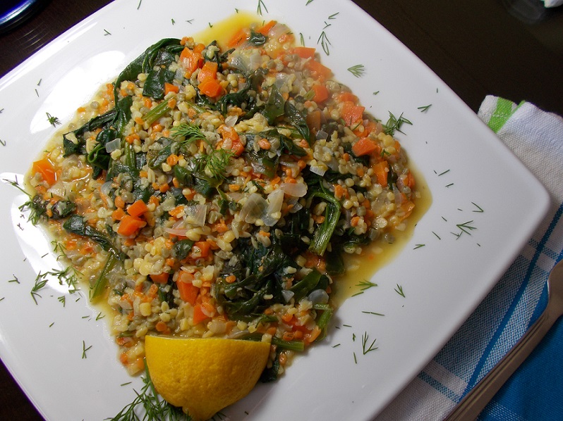 · Λίγο πριν το κατεβάσουμε από τη φωτιά προσθέτουμε το σπανάκι, λίγο ελαιόλαδο και ανακατεύουμε.