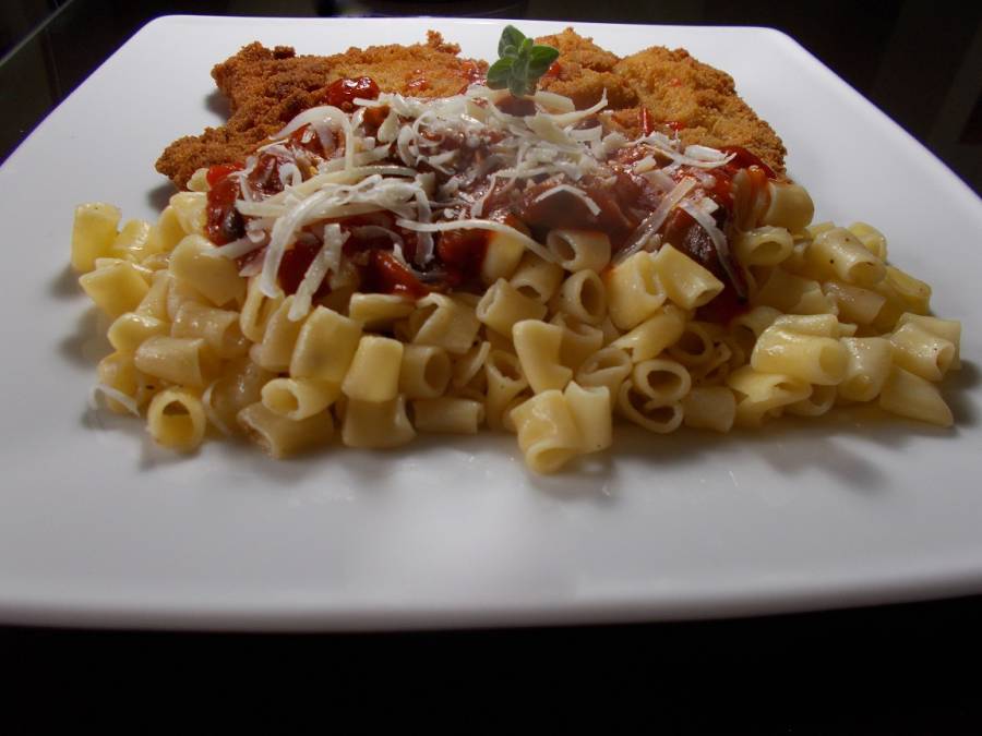 σνίτσελ χοιρινό με κοφτό μακαρονάκι Mio Gusto και κόκκινη σάλτσα με μανιτάρια